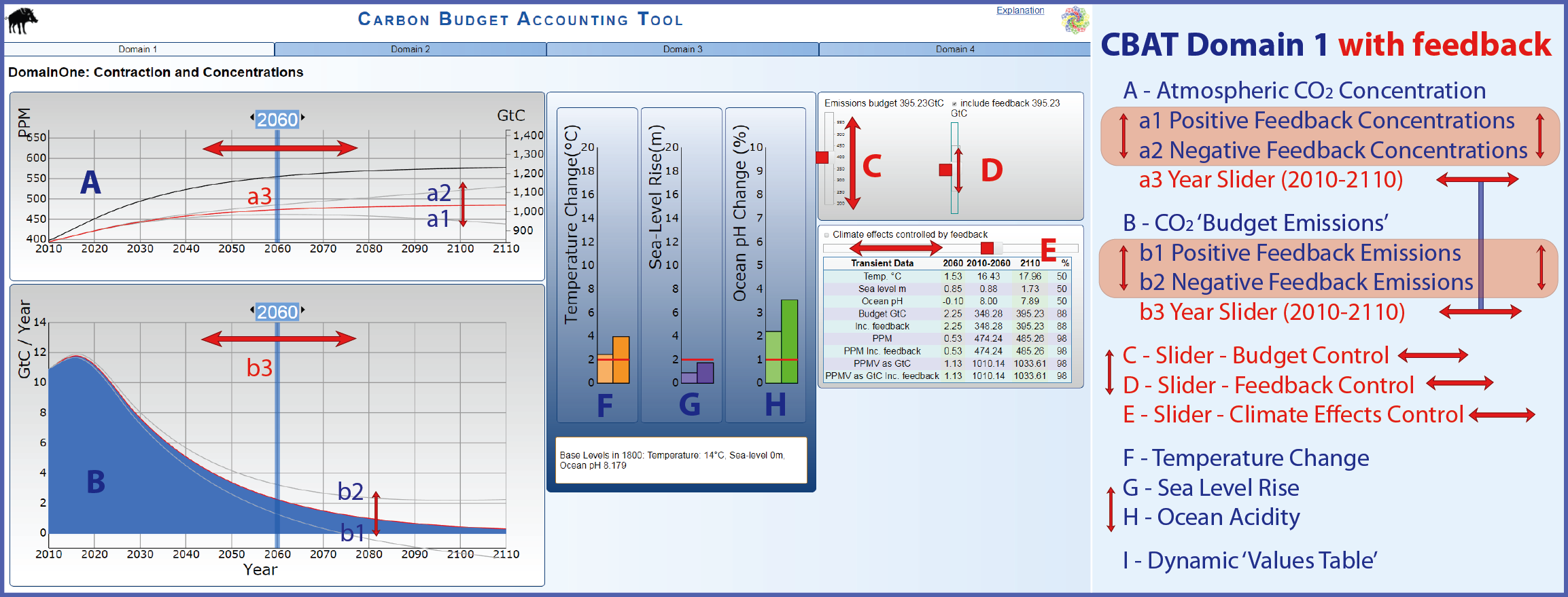 'global carbon budget' plus 'feedback emissions/effects' in Domain 1 (as with all 4 CBAT Domains) ranges between net 100 Gt C & 889 Gt C.
